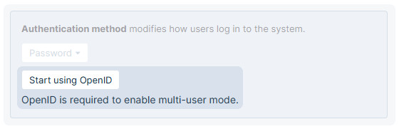 If you require a more robust authentication method than a server password, it is recommended to use an OpenID provider. Most OpenID providers support multi-factor authentication, enhancing your application's security. Additionally, if you need support for multiple users, you must enable this feature.